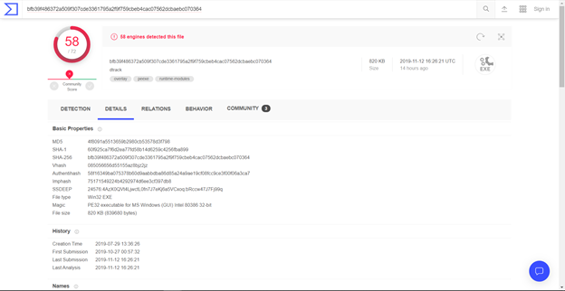 The first step was to ensure that the obtained malware was not corrupted and the same was uploaded in VirusTotal and verified. A lot of the major anti-virus vendors (58/72) were able to identify the malware.