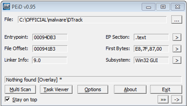 To check whether the malware was packed or not, a tool named PEiD was used. The result of the tool revealed that the malware was not packed.
