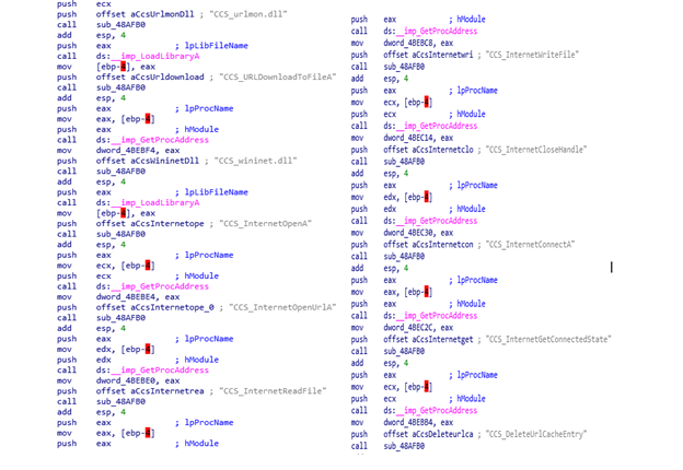 The first function sub_40100 contains all the important dll’s and libraries that are required for setting up the harvesting. The below screenshot will have few of the imported dll’s and libraries. These libraries will be loaded first when the malware is executed.