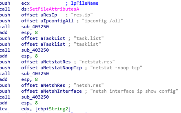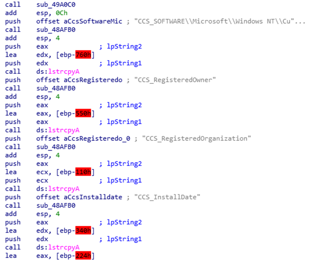 The second function sub_403040 gets the target machines local information which will be helpful in carrying out the harvesting process. The information includes host name, environment path, startup information and so on.